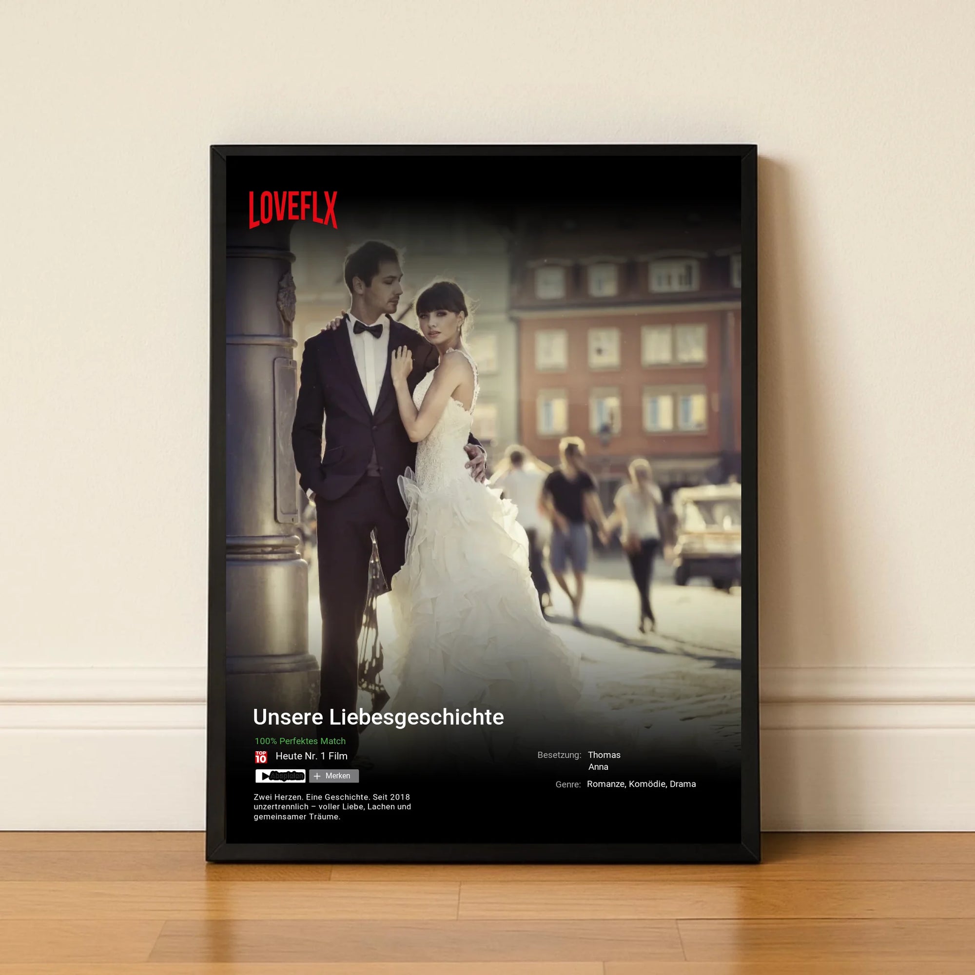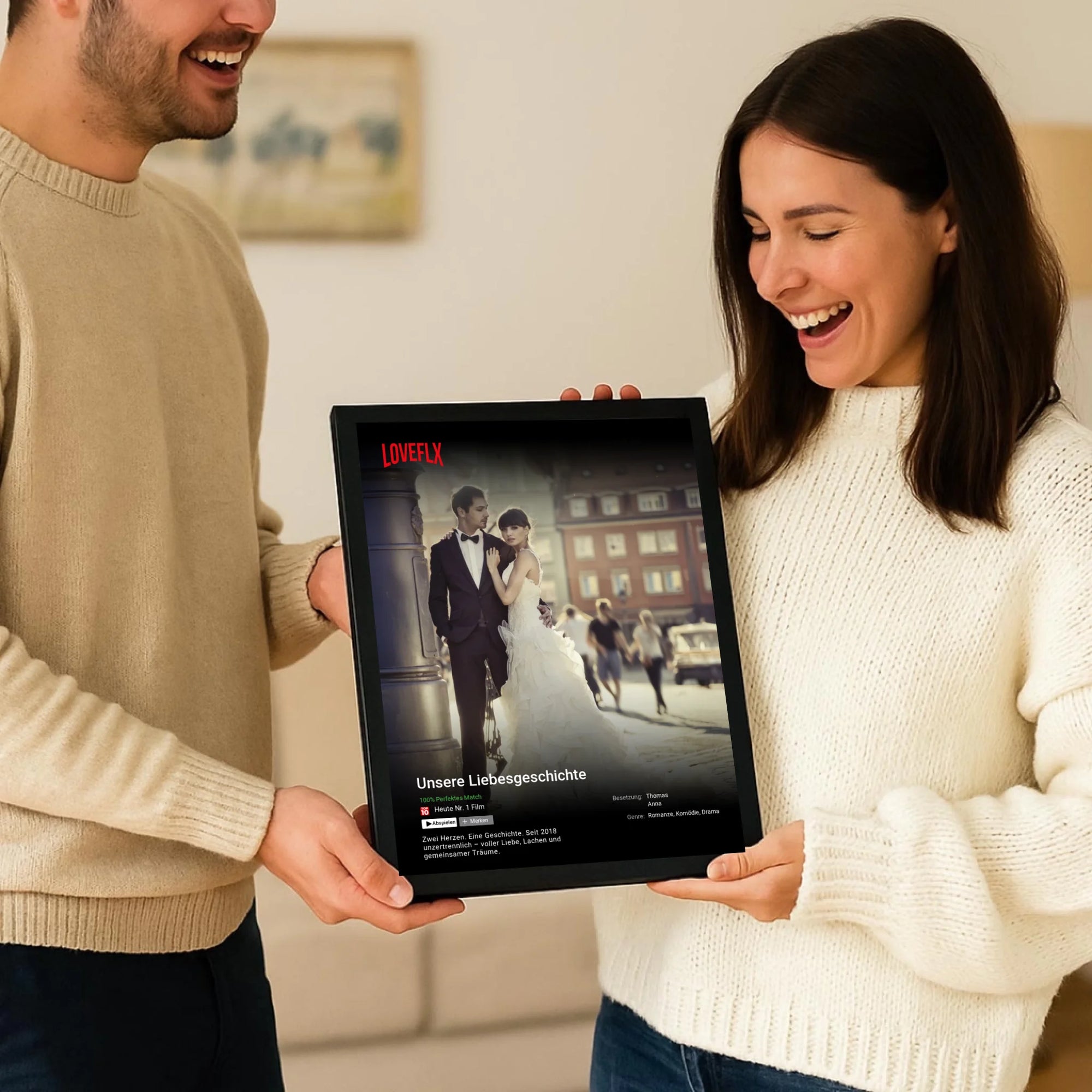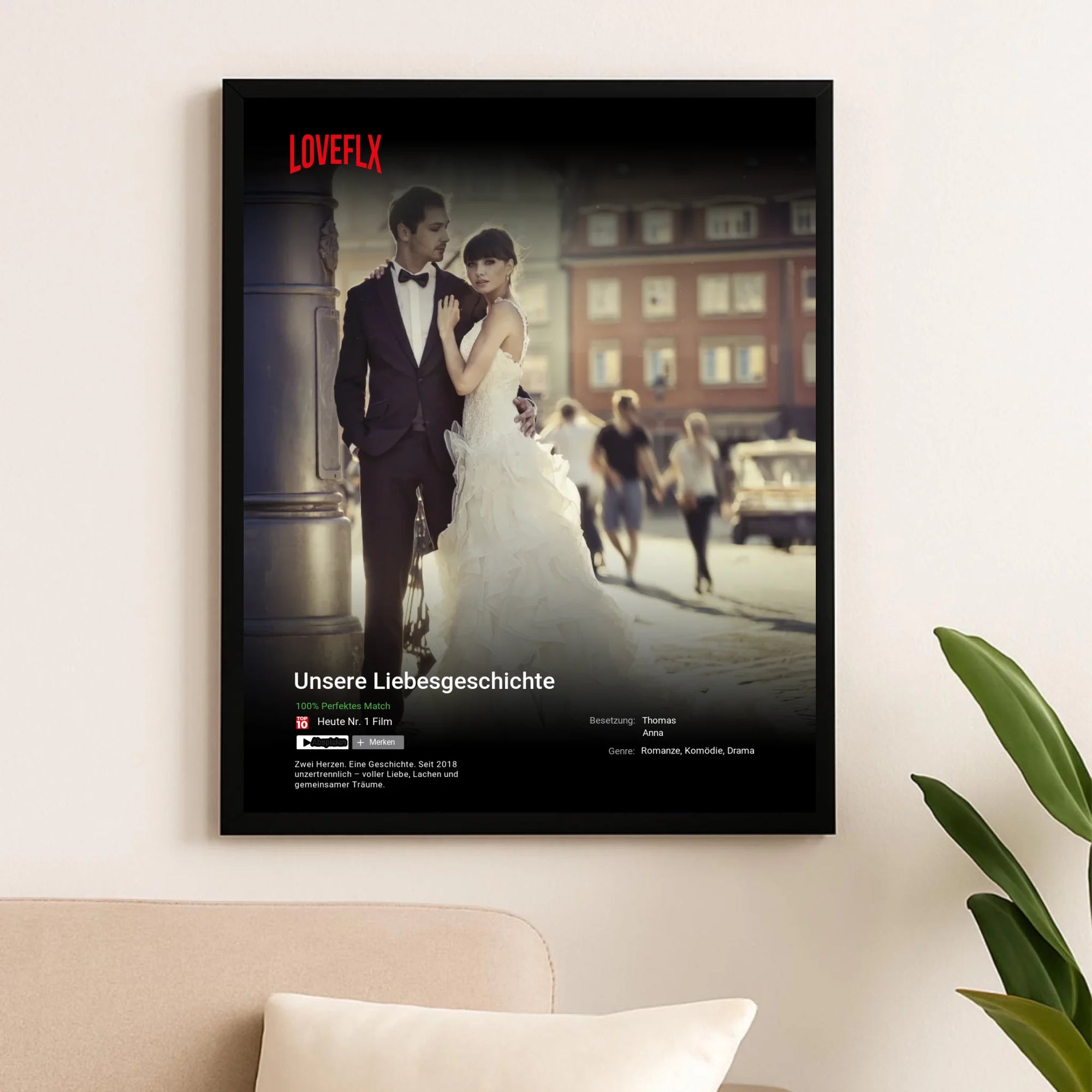 Was wäre, wenn eure Beziehung ein Film wäre? Mit diesem personalisierten Liebesfilm Poster im Streaming-Stil wird eure Geschichte zum Highlight auf der Leinwand – mit eurem Foto, euren Namen und eurer ganz persönlichen Beschreibung.